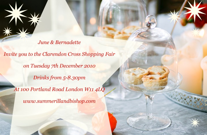 Summerill & Bishop extend an invitation to you to join them at the CLARENDON CROSS CHRISTMAS SHOPPING FAIR, on the7th of December, 100 Portland Road London, W11 4LQ, , where you will find a whole host of goodies, unique gifts, seasonal refreshments, and discounts.